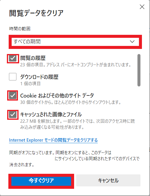 「今すぐクリア」をクリックします。