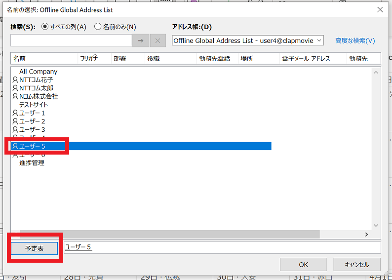3.[予定表に表示したいメンバーのメールアドレスを選択し、[予定表]をクリックします。