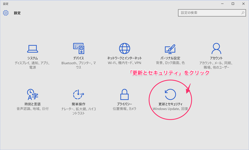 (2)「設定」一覧から、「更新とセキュリティ」をクリック。