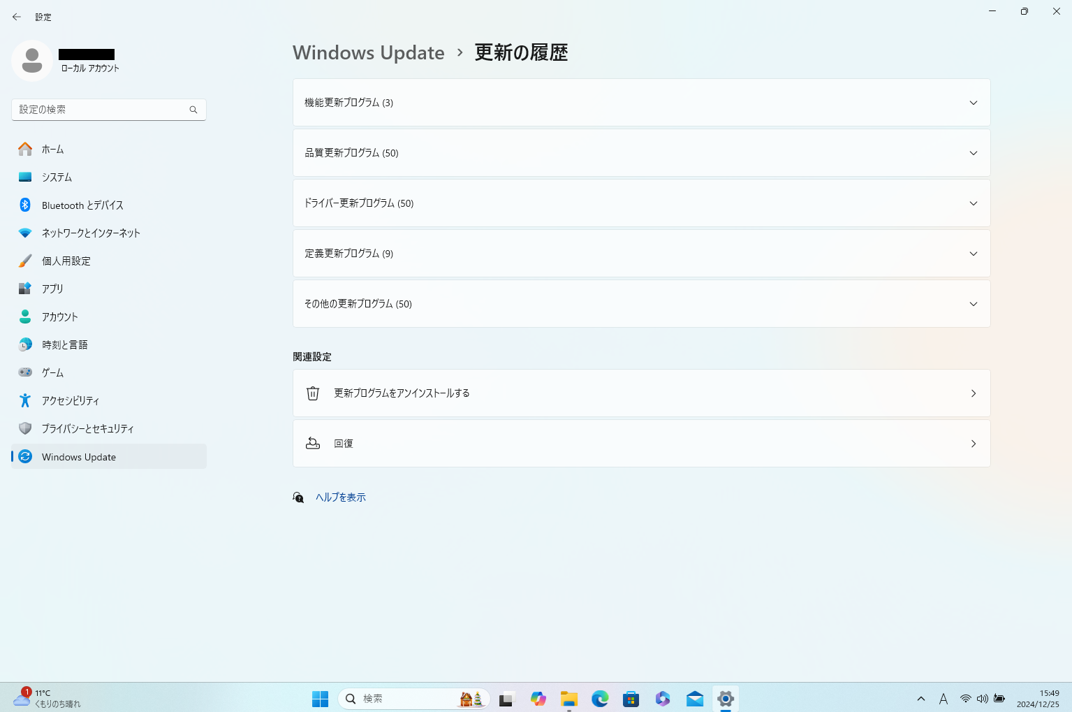 (5)「インストールされた更新プログラム」が表示され、更新プログラムがインストールされた日付などを確認することができます