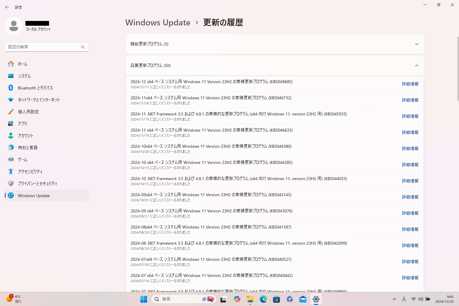 (5)「インストールされた更新プログラム」が表示され、更新プログラムがインストールされた日付などを確認することができます